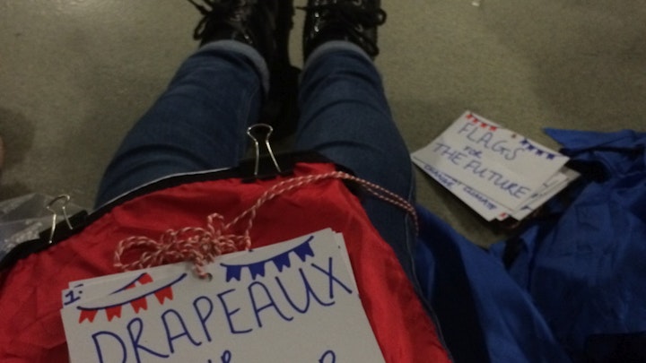 At the red line at the Arch de Triumph and down to the Eiffel Tower I began to collect responses from people around their hopes and fears for the future and asking them to write them onto red and blue flags which will be installed at an exhibition at UWE in February. The aim was to begin a conversation to inspire greater collective action. We shall see what happens next…’