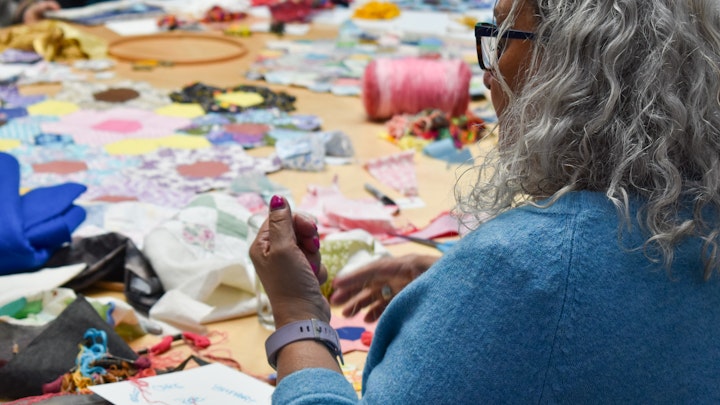 Participants shared their inspiration for the textile pieces as a group, revealing some incredibly touching dedications to mothers, grandmothers and those unseen. These words were then hand appliquéd onto found quilts, patchwork and reused fabric scraps to create their artworks.