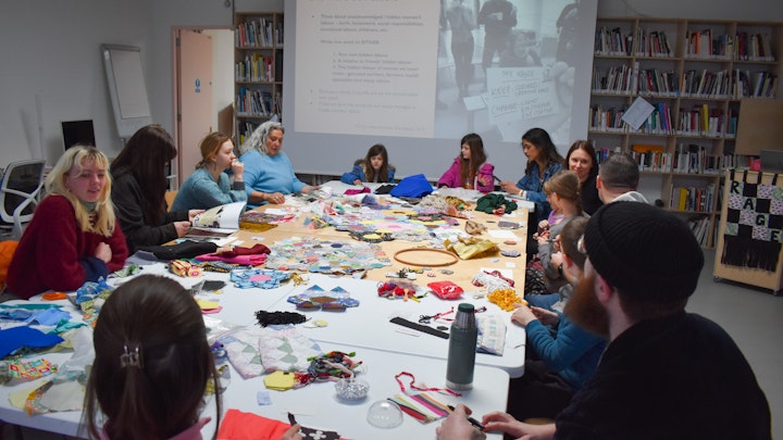 Hidden Stitches was my response to the themes of hidden women's labour in the brilliant current exhibition Five Acts by Young In Hong. A key concern and interest in my own practice as well, I invited attendees to create their own textile homages to the hidden and unacknowledged labour of women in their lives - whether that was themselves, a family member or friend, or a woman they had never met like a garment worker, farmer, health specialist or anyone else who invisibly shape our lives.