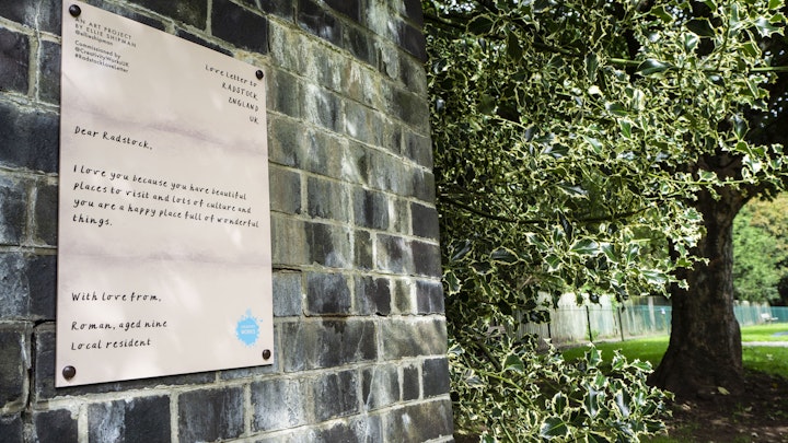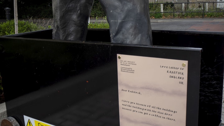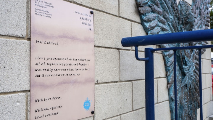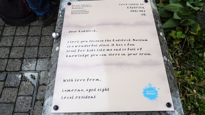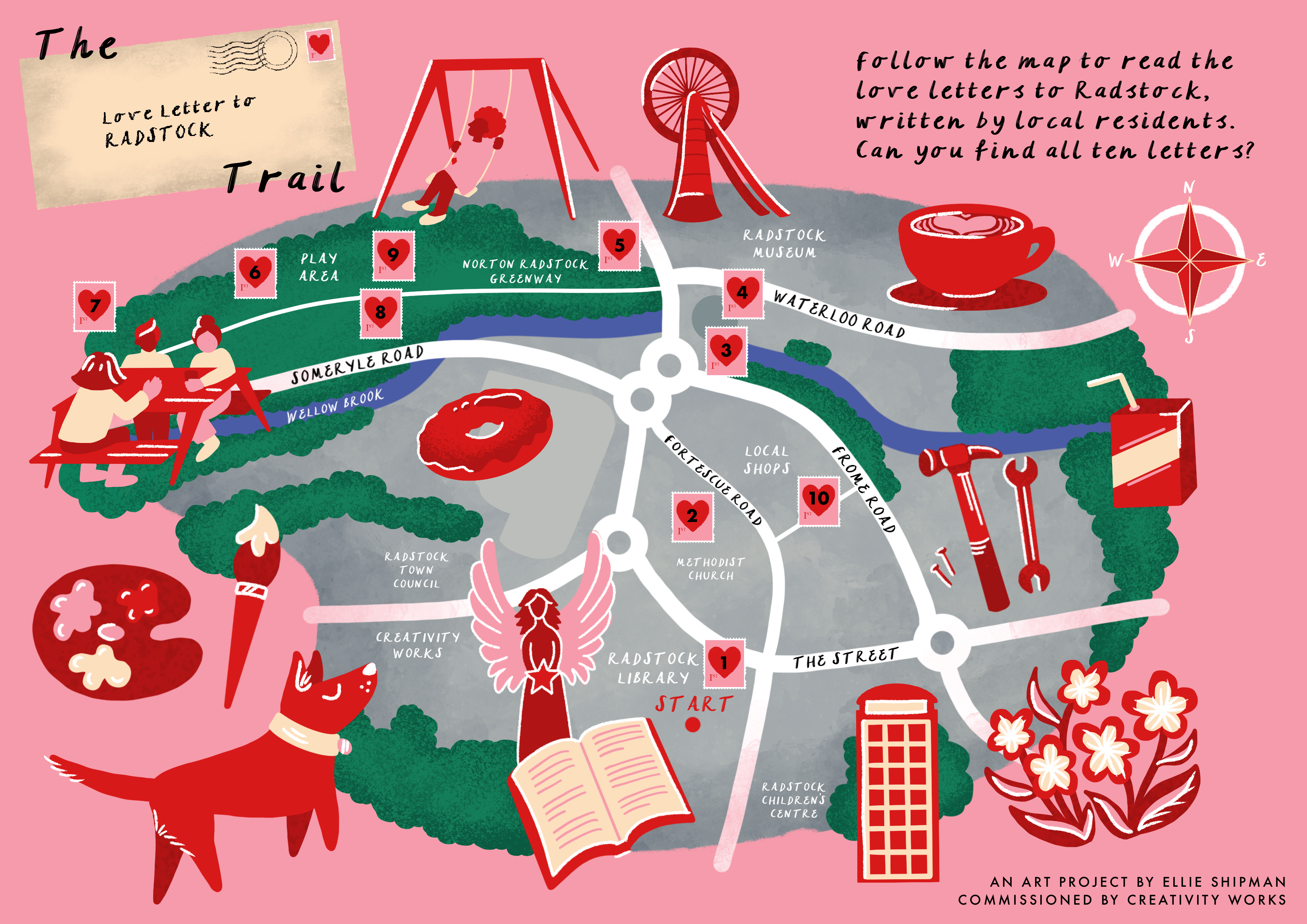 Creativity Works, supported by Radstock Town Council, commissioned artist Ellie Shipman to explore the love of Radstock with local people. Ellie invited Radstock residents to write their own love letters to the town and ‘post’ them at a special post box in the library. Ten letters have been selected and installed around the town as a permanent love letter trail. An illustrated map has been created to help explore the trail and discover the Love Letters to Radstock! How many letters can you find?