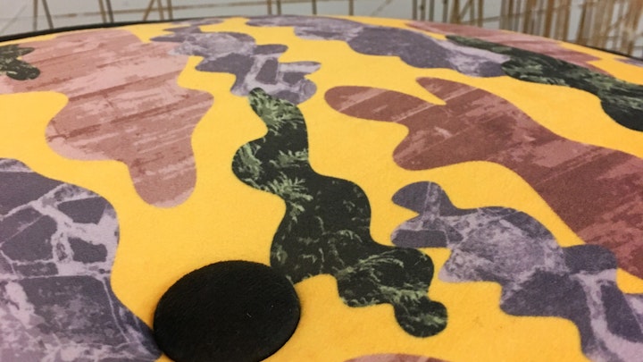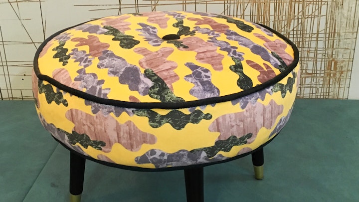 This mid-century footstool was traditionally re-upholstered from the base structure up. It is covered in my Suburban Camo soft velvet in yellow, with dark green velvet piping and button.
