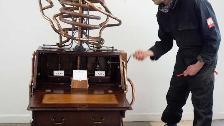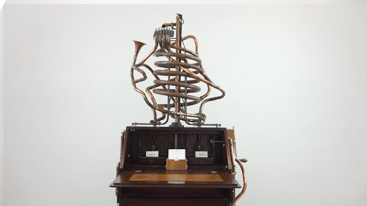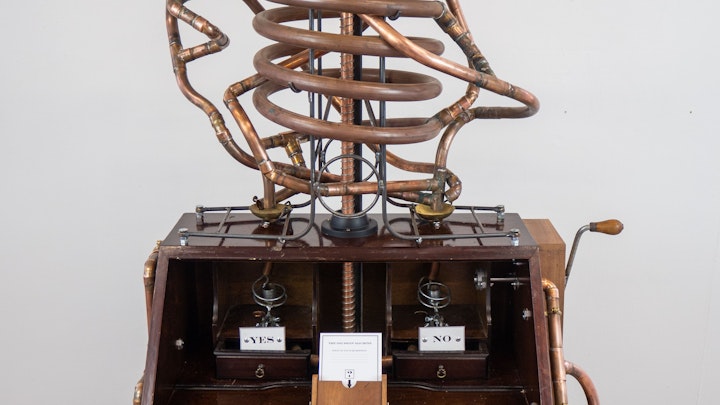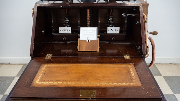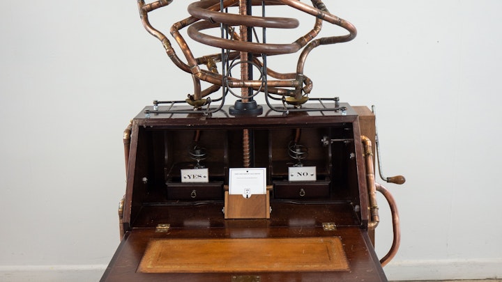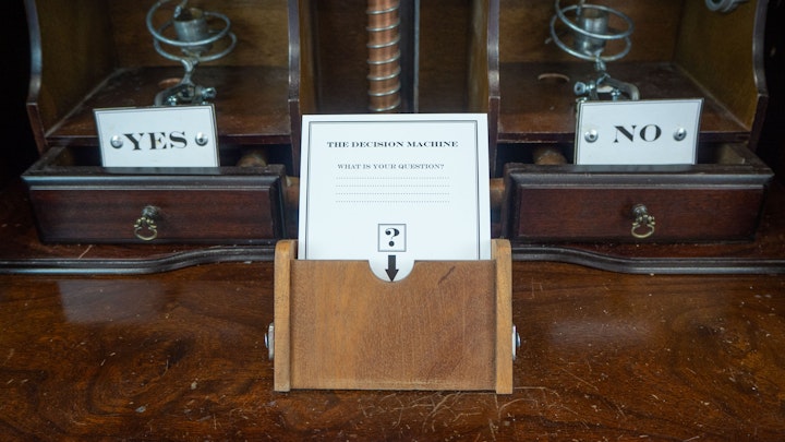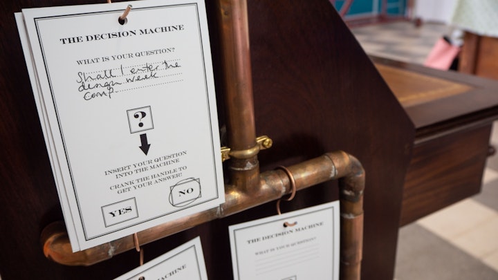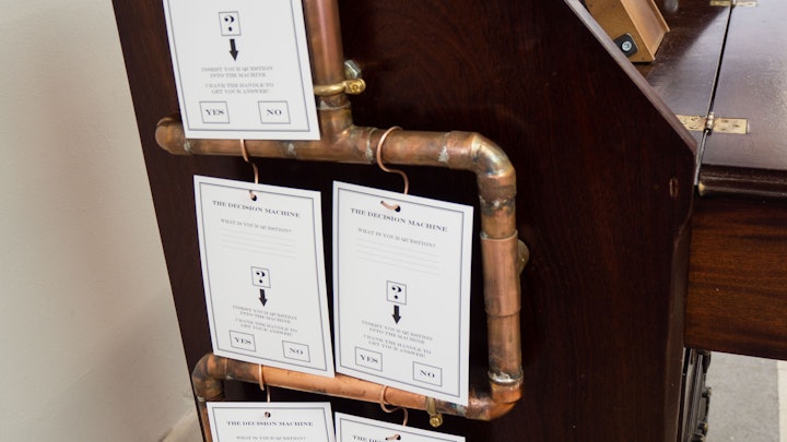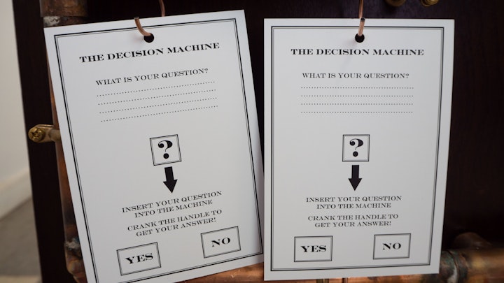 The installation invites viewers to reflect on a decision they need to make in their own lives, write it on a card and insert it into the machine then crank the handle to reveal its answer. The machine will give a simple yes or no response, reflecting the binary 0-1 foundations of digital technology as well as highlighting the almost flippant simplicity of potentially huge decisions prompting reflection on the scale and impact of decision making we undertake every day.