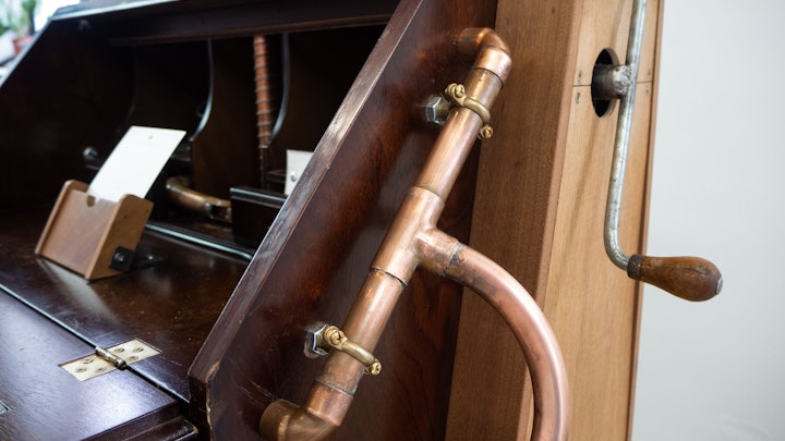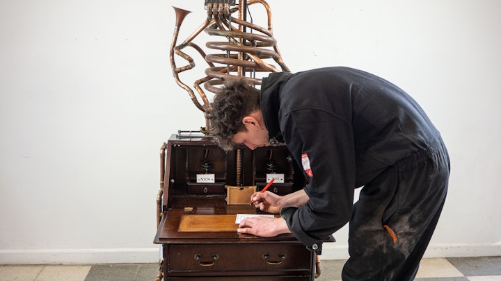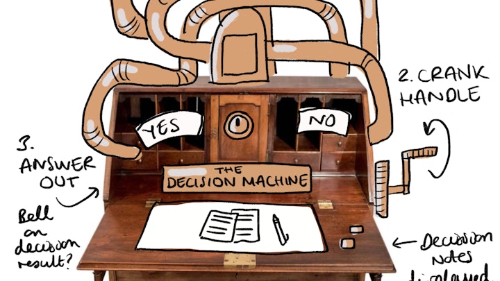 The Decision Machine was created as a playful response to this incredibly vital research - a machine adapted from a vintage writing bureau, inspired just as much by Victoriana steampunk as contraptions invented by Wallace and Gromit. The piece was wonderfully fabricated by Jack Stiling of Stiling’s Workshop.