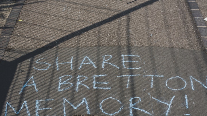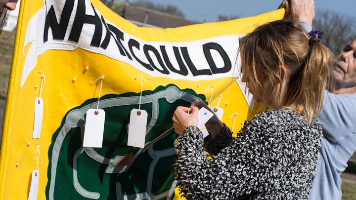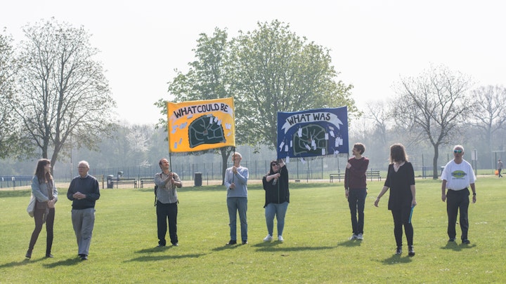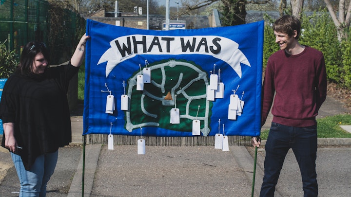 What Was and What Could Be invited residents of North Bretton, Peterborough to explore and share their memories and ideas for green space in their locality through adding them on tags to 'pearls of wisdom' on felt banners. The banners were then walked through the green spaces by the residents themselves who invited others to contribute as they went.